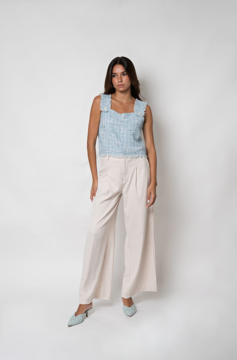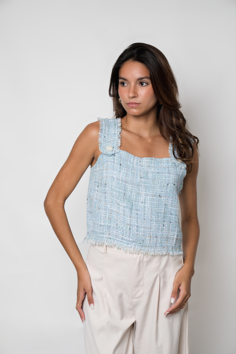 The Strap Sleeve Top is the perfect blend of modern style and classic sophistication, complete with small tweed accents for a touch of texture.