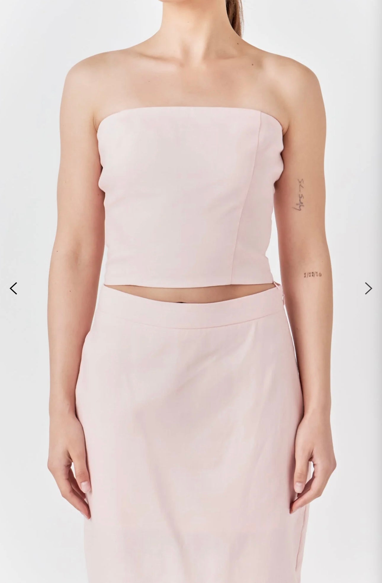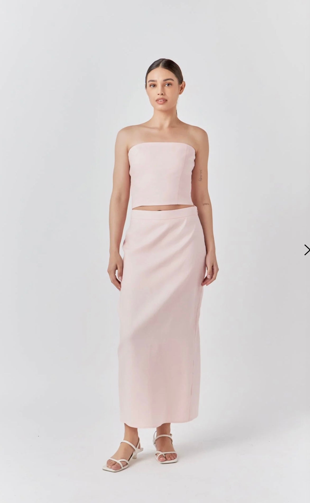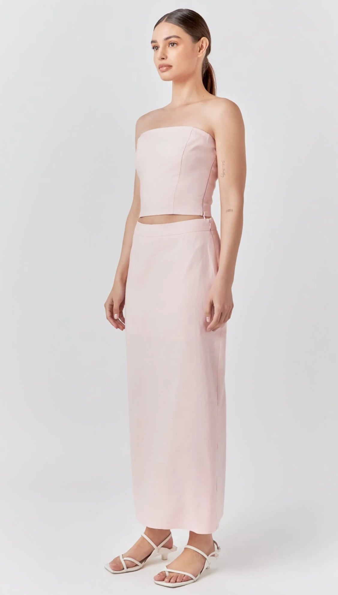 Crafted from linen, the strapless top and midi skirt of the Mia Set have an open back cut.